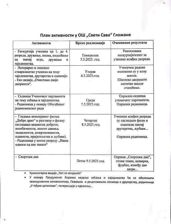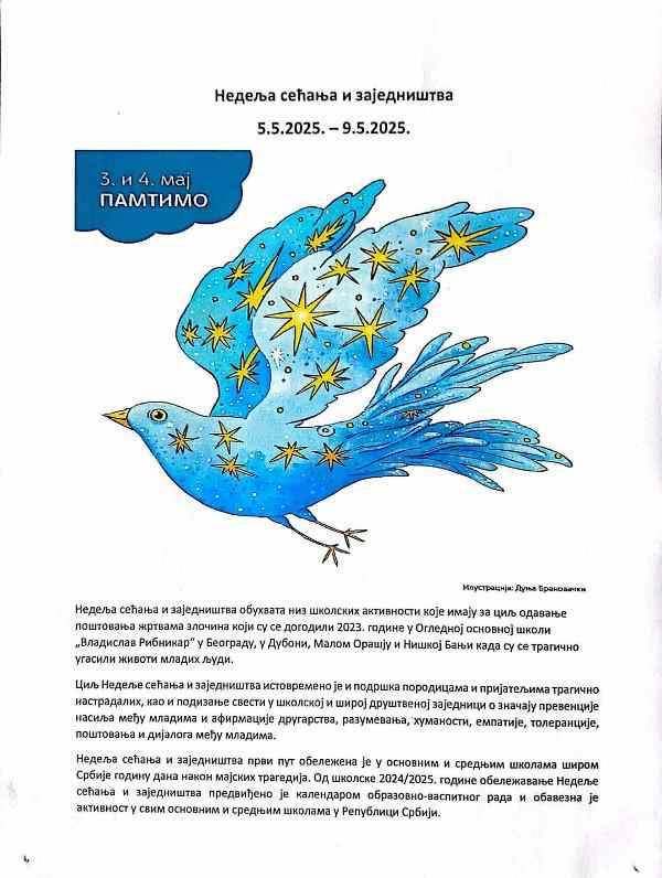 Недеља сећања и заједништва обухвата низ школских активности које имају за циљ одавање поштовања жртвама злочина који су се догодили 2023. године у Огледној основној школи „Владислав Рибникар“ у Београду, у Дубони, Малом Орашју и Нишкој Бањи када су се трагично угасили животи младих људи.